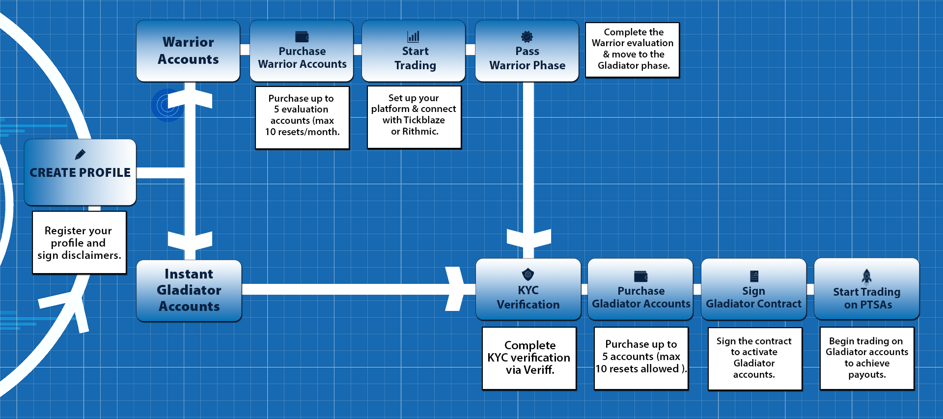- Fixed Account Settings: The account size, and drawdown settings are fixed once you purchase and must be transferred exactly over to your Gladiator PTSA after passing your Warrior Evaluation.